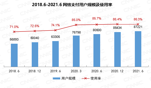 截至2021年6月,我国网络支付用户规模达8.72亿,较2020年12月增长1787万,占网民整体的86.3%。