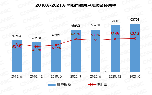 截至2021年6月,我国网络直播用户规模达6.38亿,同比增长7539万,占网民整体的63.1%。其中,电商直播用户规模为3.84亿,同比增长7524万,占网民整体的38.0%。