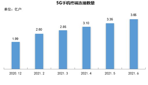 移动电话用户规模保持稳定。截至2021年6月,三家基础电信企业的移动电话用户总数达16.14亿户,较2020年12月净增1985万户;5G手机用户数迅速扩大。截至2021年6月,三家基础电信企业的5G手机终端连接数量达3.65亿户,较2020年12月净增1.66亿户。
