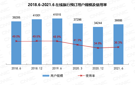 截至2021年6月,我国在线旅行预订用户规模达3.67亿,较2020年12月增长2411万,占网民整体的36.3%。