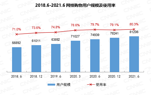 截至2021年6月,我国网络购物用户规模达8.12亿,较2020年12月增长2965万,占网民整体的80.3%。