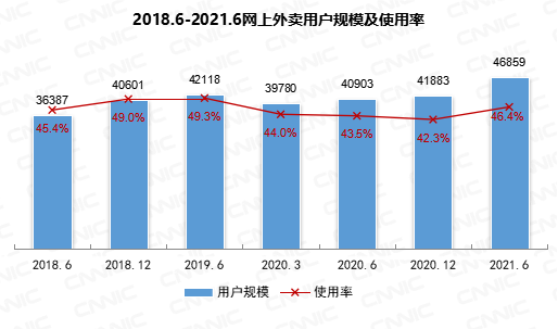 截至2021年6月,我国网上外卖用户规模达4.69亿,较2020年12月增长4976万,占网民整体的46.4%。