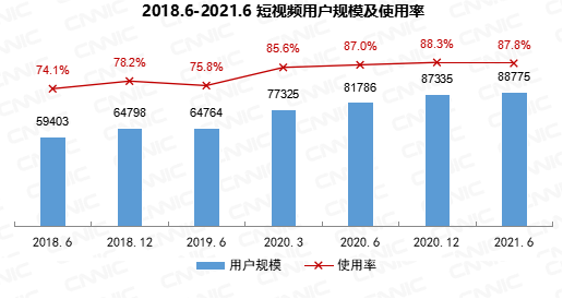 截至2021年6月,我国网络视频(含短视频)用户规模达9.44亿,较2020年12月增长1707万,占网民整体的93.4%。其中短视频用户规模为8.88亿,较2020年12月增长1440万,占网民整体的87.8%。