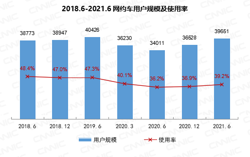 截至2021年6月,我国网约车用户规模达3.97亿,较2020年12月增长3123万,占网民整体的39.2%。
