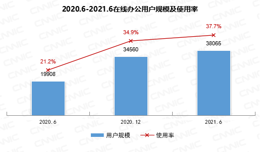 截至2021年6月,我国在线办公用户规模达3.81亿,较2020年12月增长3506万,占网民整体的37.7%。