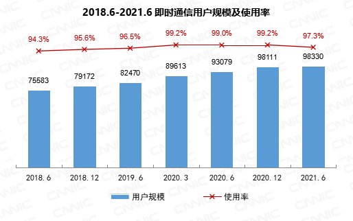 截至2021年6月,我国即时通信用户规模达9.83亿,较2020年12月增长218万,占网民整体的97.3%。
