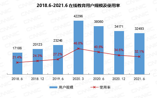 截至2021年6月,我国在线教育用户规模达3.25亿,较2020年12月减少1678万,占网民整体的32.1%。