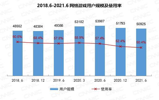 截至2021年6月,我国网络游戏用户规模达5.09亿,较2020年12月减少869万,占网民整体的50.4%。
