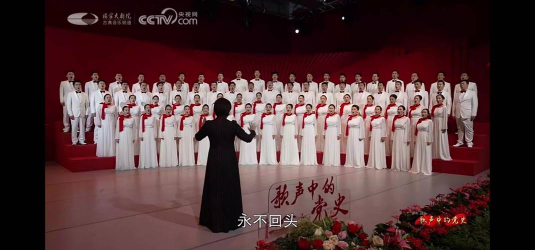 会上,指挥焦淼率国家大剧院合唱团,演绎了一首首抒发共产党人赤子情怀的合唱作品,如《国际歌》、《永远跟党走》《百年光荣》等曲目。主持人刚强、中共党史专家邵维正、作曲家印青讲述了革命先辈们的动人故事,追寻“来时路”上的辉煌足迹,坚定“永远跟党走”的信心信念。