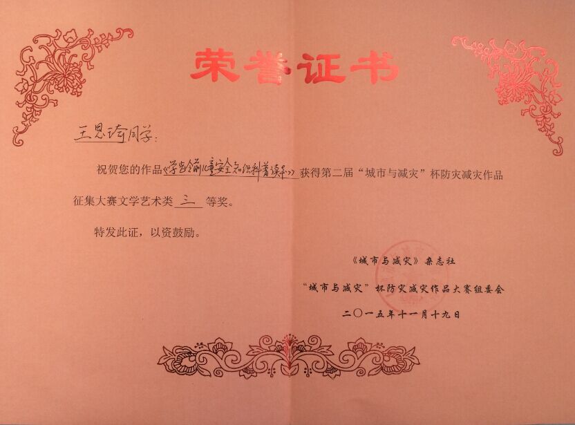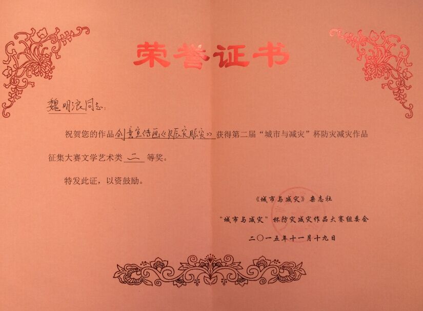 在刚刚结束的第二届“城市与减灾杯”防灾减灾作品大赛中,我系魏明浪同学获得文学艺术类二等奖,王思琦等同学的作品获得文学艺术类三等奖。