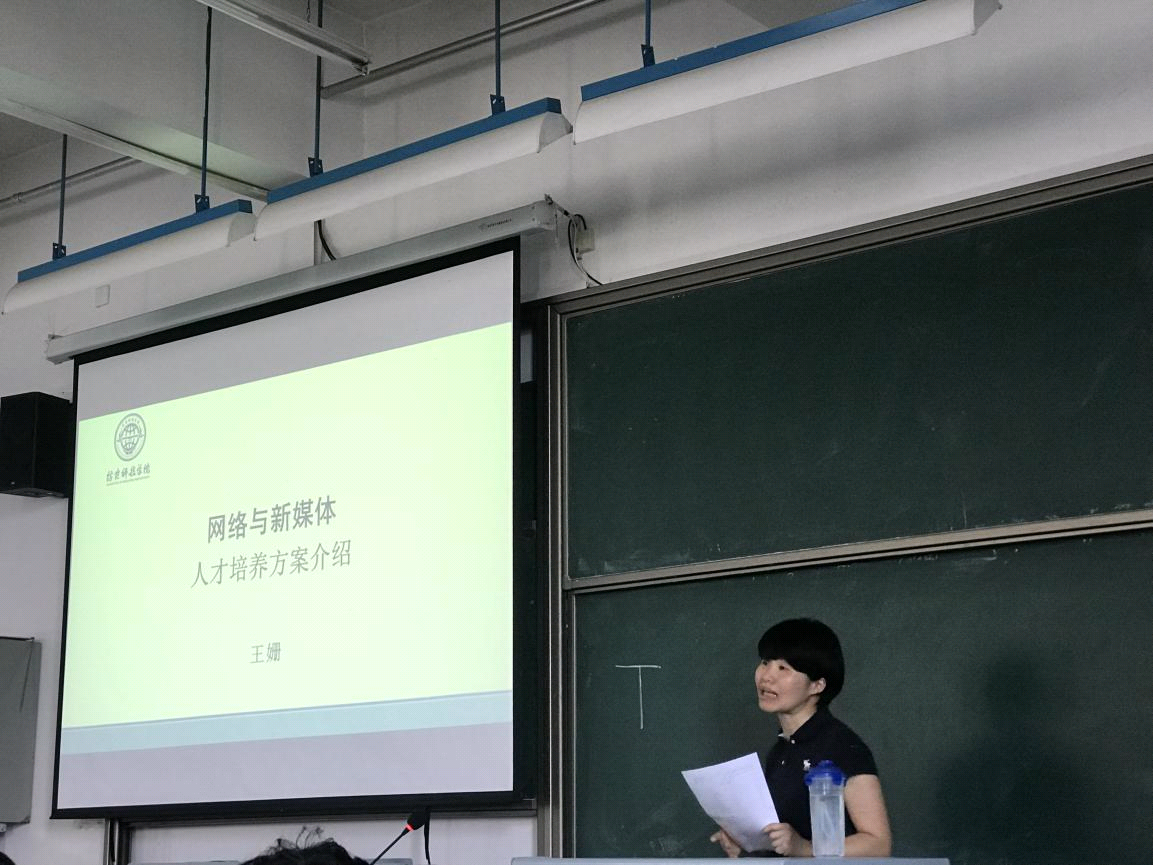 王姗老师首先就网络与新媒体的专业前景进行了介绍,认为新媒体已成为当今社会的操作系统,对整个社会的运行和发展具有深刻影响,新媒体人才需求量大,高水平、全方面的新媒体人才更是目前就业环境中的缺口所在。王姗老师对学科平台课和专业核心课的课程设置进行解读,向同学们强调每一门课程的基础性、必备性和重要性。同时,王姗老师详细阐述了网络与新媒体专业分模块教学的目的、意义和初衷,将新媒体设计模块、新媒体传播模块的培养目标、培养重点、课程设置等内容进行了深入剖析。