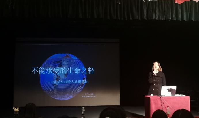 北川经历了十年前的5.12特大地震之后成为现如今全国遗址残留最大最完整的县城,郝思迪同学讲述了她第一次到达北川的所见所感,对比北川建筑地震前和地震后的样子,就建筑优势和建筑劣势做出了分析。从地震定义到灾区实景,从经济损失到人文亲情,她用一个个鲜活饱满感人肺腑的故事,颠覆了大家对地震的常态想象,也真正让同学们认识到了生命可贵人事无常。其中提到的北川中学,背后全是高山,当地震来临时,山体滑坡,大约有一千五百多人,全无生还可能。还有位学生的母亲每年都在旗杆下挂出为遇难儿子写的信,让大家再一次感受到生死在亲情面前显得是那样无助。之后介绍了参观北川地震局所看到的北川地震局的地震勘测技术的发展,采取对地球地脉波进行实时监测等措施,力争在地震发生的第一时间找到震源并进行救援。