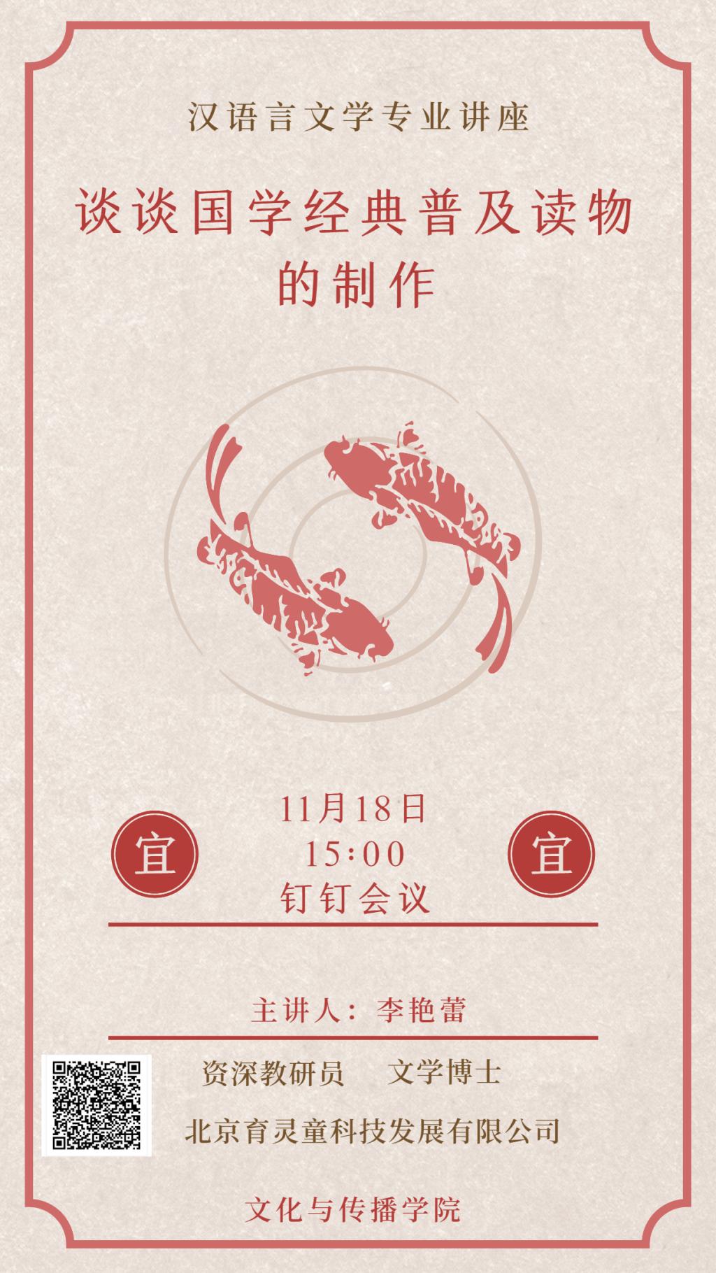 2021年11月18日下午三点,文学博士、北京育灵童科技发展有限公司资深教研员李艳蕾来到kaiyun中国官方网站,为广大师生开设了《谈谈国学经典普及读物的制作》学术讲座。本次讲座用钉钉线上会议的形式开展,由kaiyun中国官方网站副院长唐元主持,汉语言文学教研室主任张静组织,汉语言文学专业和众多其他专业的同学共计百余人参加了活动。