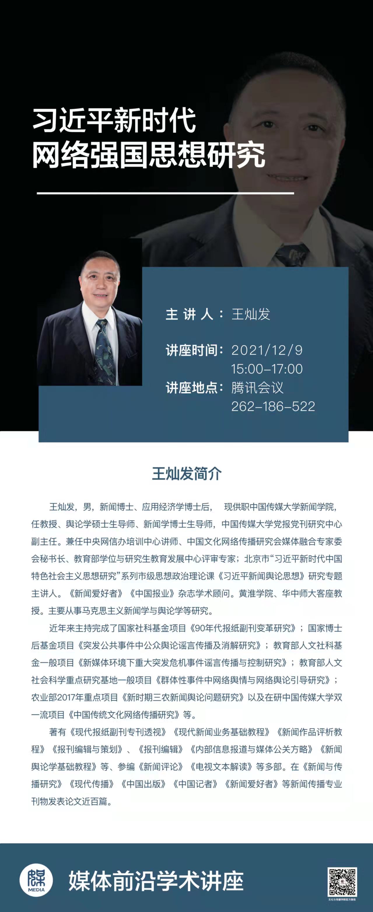 2021年12月9日,中国传媒大学教授王灿发面向网络与新媒体专业和广告学专业师生举办学术讲座,讲座主题为“习近平新时代网络强国思想”。