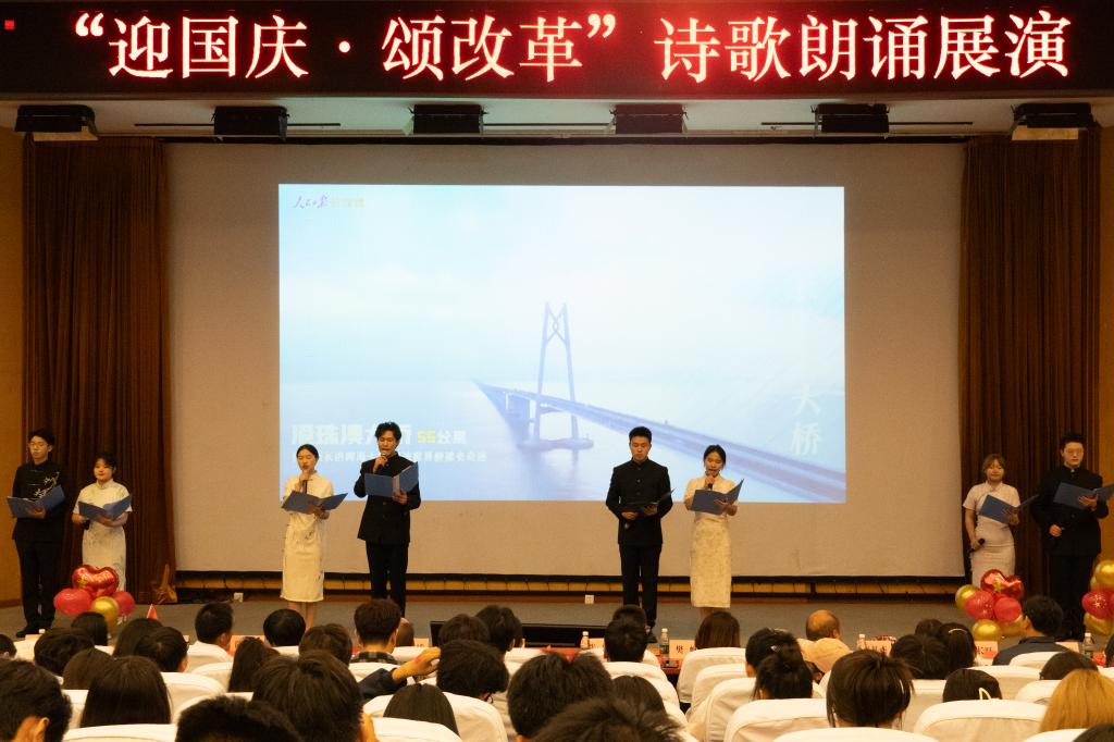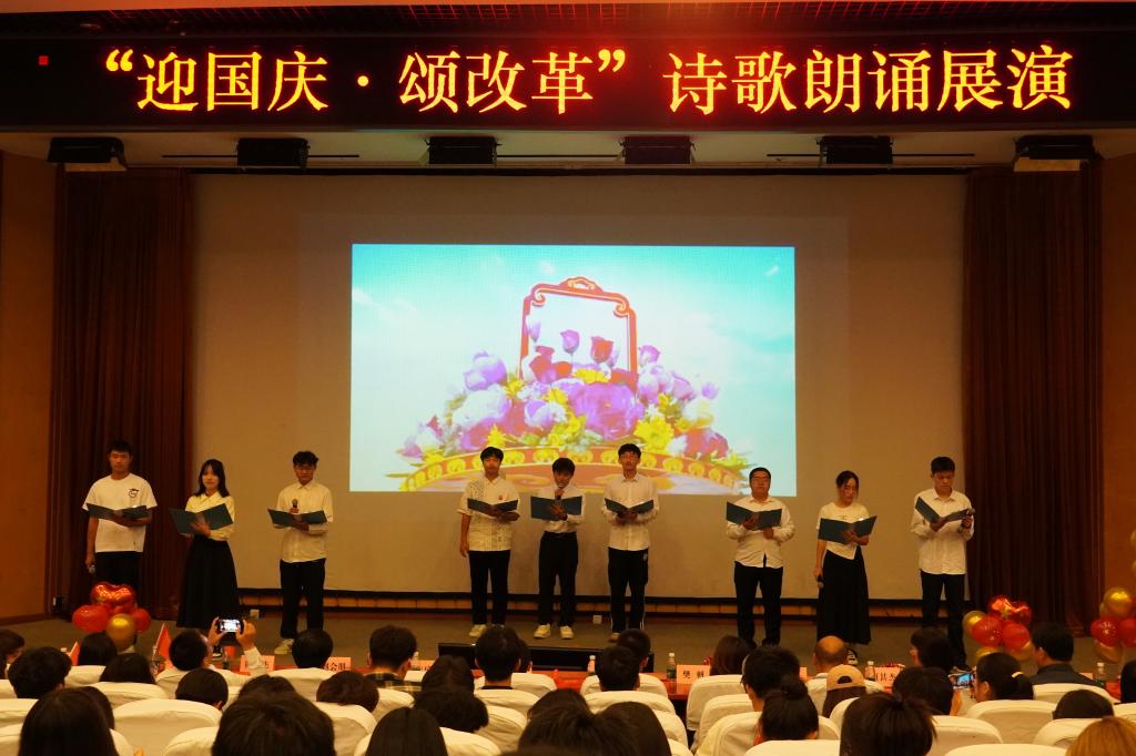 为庆祝中华人民共和国成立75周年,进一步深入学习贯彻党的二十届三中全会精神,营造奋进新征程的良好氛围,9月27日,学校各二级学院党总支联合举办了“迎国庆颂改革”诗歌朗诵展演。来自10个学院的11支队伍通过诗歌朗诵、情景剧等方式向新中国75周年华诞深情献礼,用实际行动学习践行党的二十届三中全会精神。党委组织部、宣传部、学生工作部、机关党总支、团委等相关负责人莅临现场观摩指导。