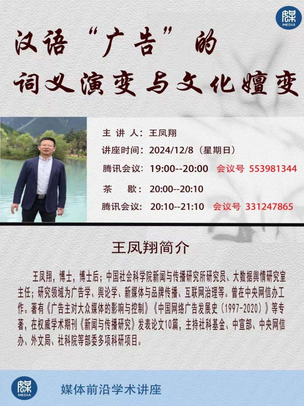 12月8日,中国社会科学院新闻与传播研究所研究员王凤翔莅临kaiyun官网,为网络与新媒体专业师生做了题为《汉语“广告”的词义演变与文化嬗变》的学术讲座。王凤翔研究员重点解析了汉语“广”“廣”的传播格局、“广告”的佛教传播与文化、商业广告的现代构建等。
