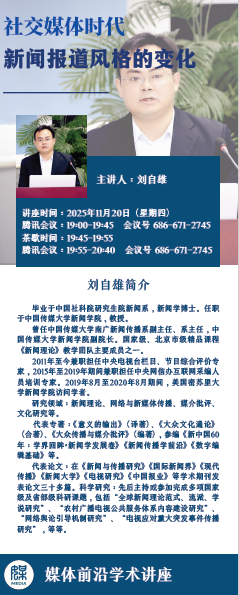11月20日19点,中国传媒大学教授刘自雄举行学术讲座,深度剖析社交媒体时代新闻报道风格发生的深刻变革。本次讲座内容基于其系统研究,为听众勾勒出新闻业从前专业主义到专业主义再到后专业主义的风格演进图谱。
