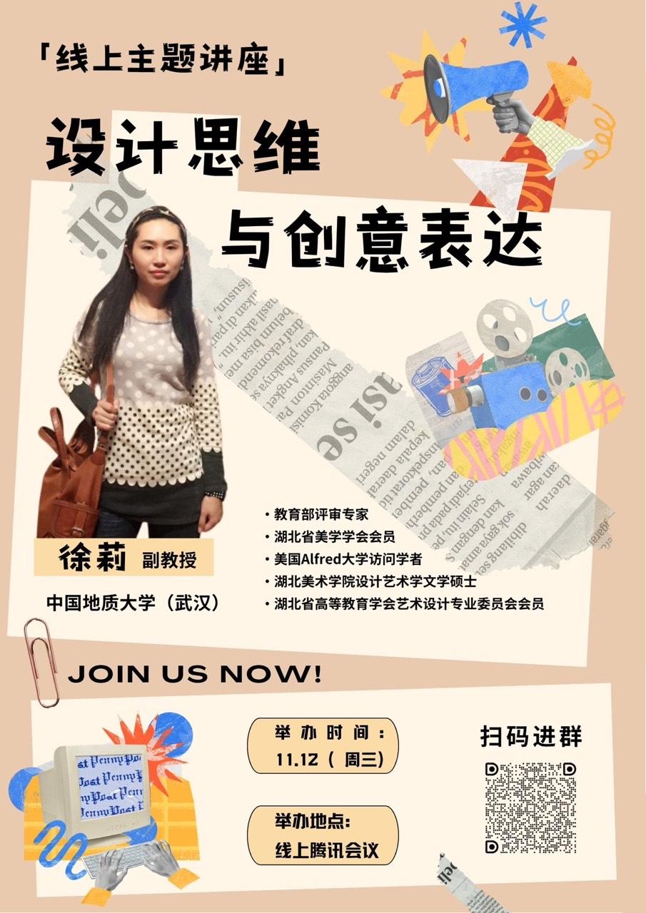 为进一步推进学院人才培养工作,加强学生专业思维培养与专业视野的拓展,11月12日下午14:30,中国地质大学(武汉)徐莉副教授应邀为学院师生作题为“设计思维与创意表达”的线上专业主题讲座。学院广告学、网络与新媒体、汉语言文学等专业90余名学生生参加了讲座学习。会议由学院创新创业中心主任梁娟主持。