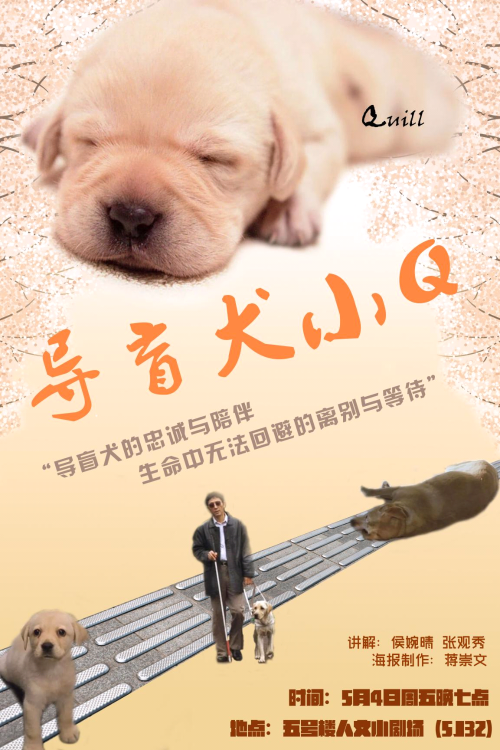 人文电影赏析活动将于5月4日(周五)晚七点,在人文小剧场(5J32)举行,本周将放映经典电影《导盲犬小Q》。该电影改编自日本作家石黑谦吾的长篇小说《再见了,可鲁》,由朝鲜裔日本导演崔洋一执导,小林薰、椎名桔平、香川照之、户田惠子及黑谷友香等联袂主演。书中的可鲁曾经真实存在,生卒年为1986年6月25日到1998年7月20日。一只聪明的、一生都在工作的狗,在人世间走过了12年的岁月,日后它的故事被记录、被传播,使除了他的主人和作者之外的更多人被感动。据说,作者用了15年的时间才完成这只小狗的传记。时间证明,这15年的付出是值得的,因为在出版后的一年多时间里,这本书已经被认为是21世纪“感动1亿亚洲人心”的超级畅销好书和21世纪亚洲“赚得泪水最多”的一本书。该片在2004年3月于日本上映,获得第24届香港电影金像奖最佳亚洲电影提名。本期讲解员:侯婉晴、张观秀;海报制作:蒋崇文;指导老师:张静。欢迎广大师生前来观看。
