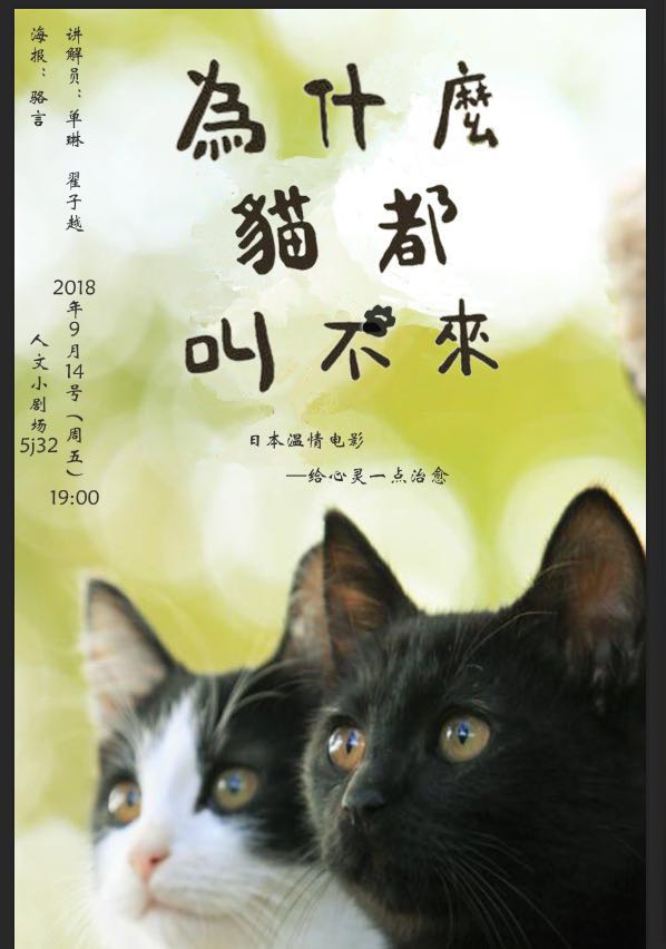 人文电影赏析活动将于9月14日(周五)晚七点,在人文小剧场(5J32)举行,本周将放映日本电影《为什么猫都叫不来》。该片改编自以杉作代表作绘本漫画《酷猫小黑的生活日记》。该剧讲述了喜欢狗的主人公因为哥哥突然捡回来两只野猫而开始与猫一起的生活。这部电影既是一部讲述人与动物之间的温情电影,又可以看作是一部职业剧,并且是孤独小人物的励志史。猫给的每一次启发、每一次感悟,对于主角光雄来说,都对照在自己的事业生涯。与其说《为什么猫都叫不来》是一部关于猫的电影,不如说它讲述的是如何通过猫认识自己、和自己沟通、与世界相处的故事。本期讲解员:翟子越、单琳;海报制作:骆言;指导老师:张静。欢迎广大师生前来观看。