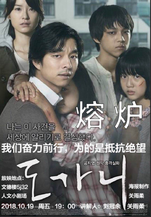 人文电影赏析活动将于10月19日(周五)晚七点,在人文小剧场(5J32)举行,本周将放映韩国电影《熔炉》。《熔炉》是根据韩国作家孔枝泳同名小说改编的剧情电影,影片由黄东赫执导,孔刘、郑有美、金贤秀、金志映等主演。该片以2000年至2004年间发生于韩国光州一所学校中性暴力事件为蓝本,描述该学校所引发的悲剧以及学校的教师和人权运动者一起力图揭开背后黑幕的故事。影片给人的第一观影感受是悲凉和绝望,里面的每一个细节都让人触目惊心,而比这场儿童性侵害事件更令人发指的是——原本该行使着正义、公平的人背后却偏袒权贵,进行着肮脏腐败的交易。由于该影片所反映出的社会问题受到韩国政府高度关注,故该电影亦被称为“改变韩国国家的影片”。本期讲解员:刘冠余;海报制作:关雨柔;指导老师:张静。欢迎广大师生前来观看。