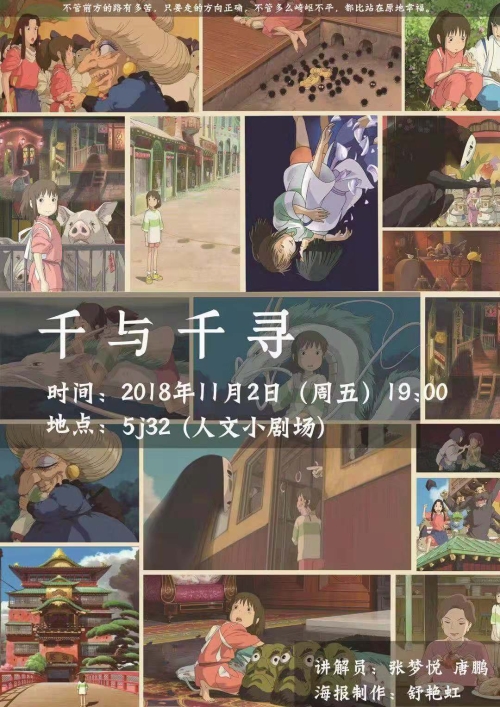 人文电影赏析活动将于11月2日(周五)晚七点,在人文小剧场(5J32)举行,本周将放映日本经典电影《千与千寻》。《千与千寻》是宫崎骏执导、编剧,吉卜力工作室制作的动画电影。讲述了少女千寻意外来到灵异世界后发生的故事。本片荣获2003年奥斯卡金像奖最佳长篇动画,同时也是历史上第一部至今也是唯一一部以电影身份获得欧洲三大电影节柏林金熊奖的动画作品。影片中,千寻的历险经历为观众提供了充满回味和内省的幻想空间。宫崎骏通过电影传达了深沉的理念:这个世界充满诱惑和陷阱。一不小心,贪婪就会发动,人们便会不由自主地陷入欲望的深渊而不能自拔,从而有力地发出了对世人的警示。本期讲解员:张梦悦、唐鹏;海报制作:舒艳红;指导老师:张静。欢迎广大师生前来观看。