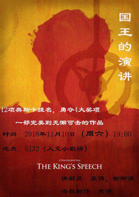 人文电影赏析活动将于11月10日(周六)晚七点,在人文小剧场(5J32)举行,本周将放映英国电影《国王的演讲》。影片讲述了1936年英王乔治五世逝世,王位留给了患严重口吃的艾伯特王子,后在语言治疗师莱纳尔·罗格的治疗下,克服障碍,在二战前发表鼓舞人心的演讲的经历。电影所包含的历史背景虽然是电影重要的吸睛点,但其实在观看完整部电影之后,我们更多地不是关注国王的成就,而是关注国王如何克服自身的心理障碍,完成自我的突破和脱变。人无完人,我们每个人都有着各自的缺陷,而这些缺陷往往是我们终及一生都无法克服的,这部电影很好地向我们展示了如何去突破自我,如何实现个人的蜕变。本期讲解员:谢柳清、张倩;海报制作:高宇;指导老师:张静。欢迎广大师生前来观看。