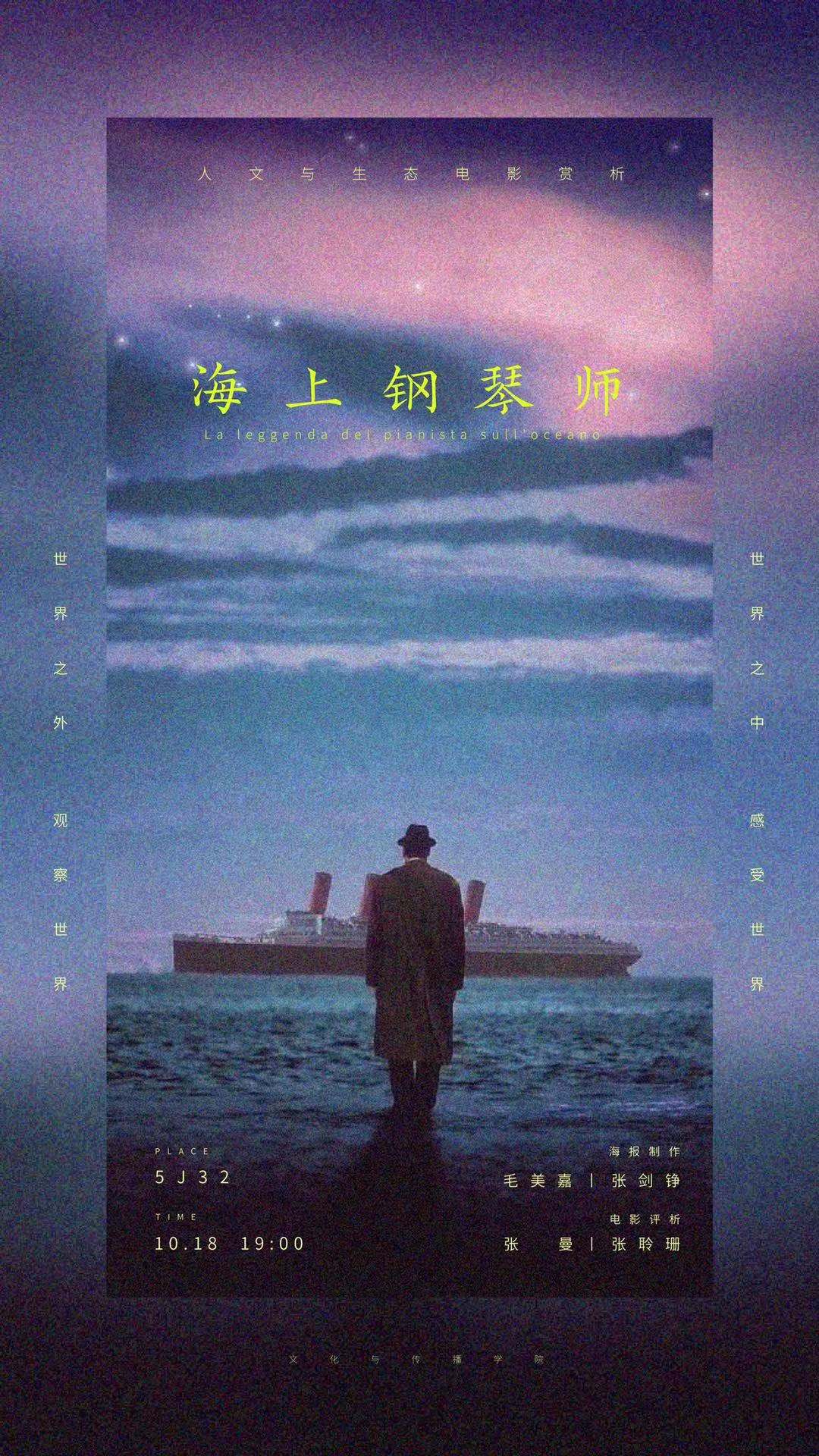 人文电影赏析活动将于10月18日(周五)晚七点,在人文小剧场(5J32)举行,本周将放映意大利电影《海上钢琴师》。《海上钢琴师》(The Legend of 1900)改编自亚历山卓•巴利科1994年的剧场文本《1900:独白》,影片讲述了一个被命名为“1900”的弃婴在一艘远洋客轮上与钢琴结缘,成为钢琴大师的传奇故事。本期讲解员:张聆珊;张曼。海报制作:张剑铮;毛美嘉。指导老师:张静。欢迎广大师生前来观看。