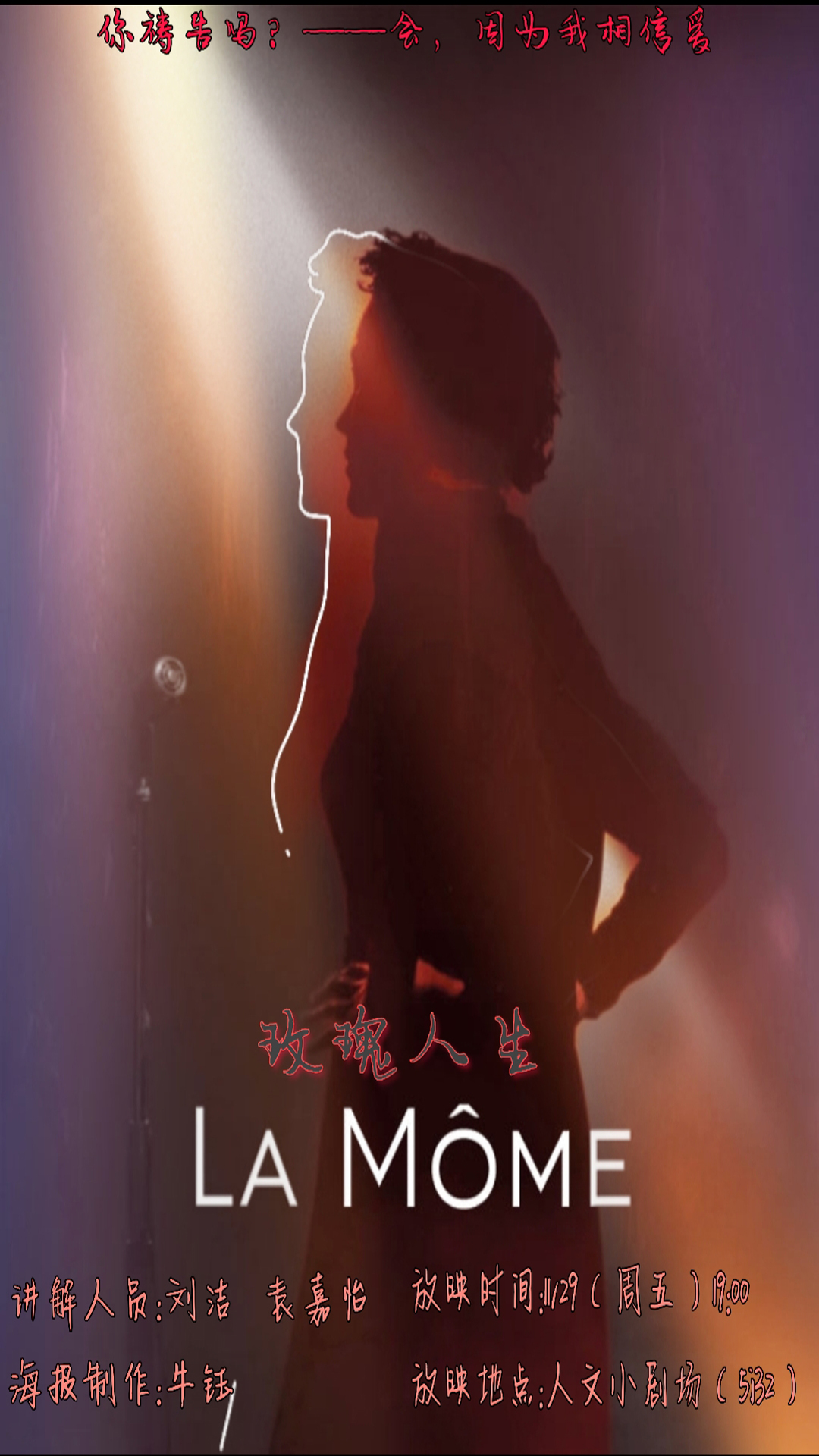 人文电影赏析活动将于11月29日(周五)晚七点,在人文小剧场(5J32)举行,本周将放映法国电影《玫瑰人生》。《玫瑰人生》,一首熟悉而动听的旋律,但有多少人知道演绎这首歌曲的艾迪丝·皮雅芙度过的悲情人生。《玫瑰人生》是由法国发行的140分钟传记影片。该片讲述了法国香颂女歌手艾迪丝·皮雅芙跌宕起伏的传奇四十七年。本期讲解员:刘洁;袁嘉怡。海报制作:牛钰。指导老师:张静。欢迎广大师生前来观看。